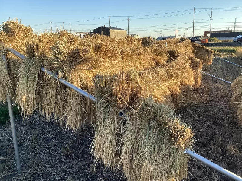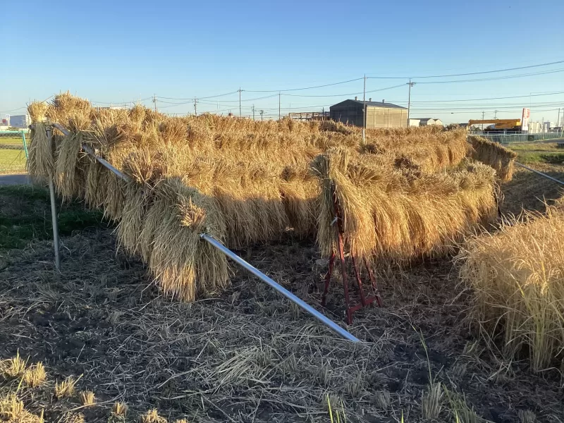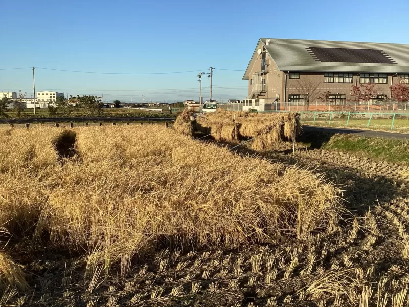 れいんぼうワークスさんのバインダーで稲刈り、さらに脱穀機までお借りして、